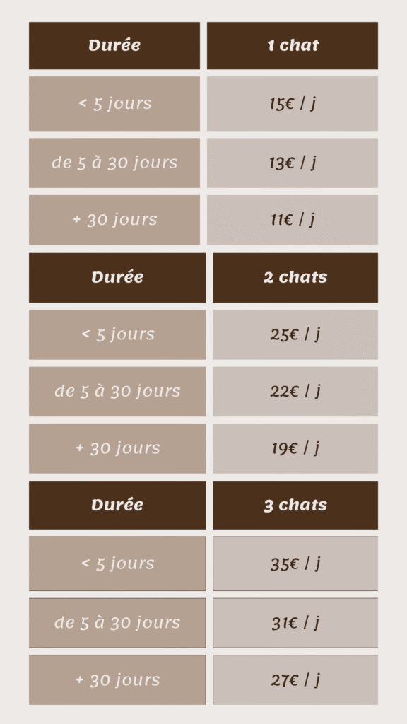 • Gourmet : Inutile d’apporter la nourriture nous fournissons des croquettes de marque Purina one: 0.5€ par jour et par animal
